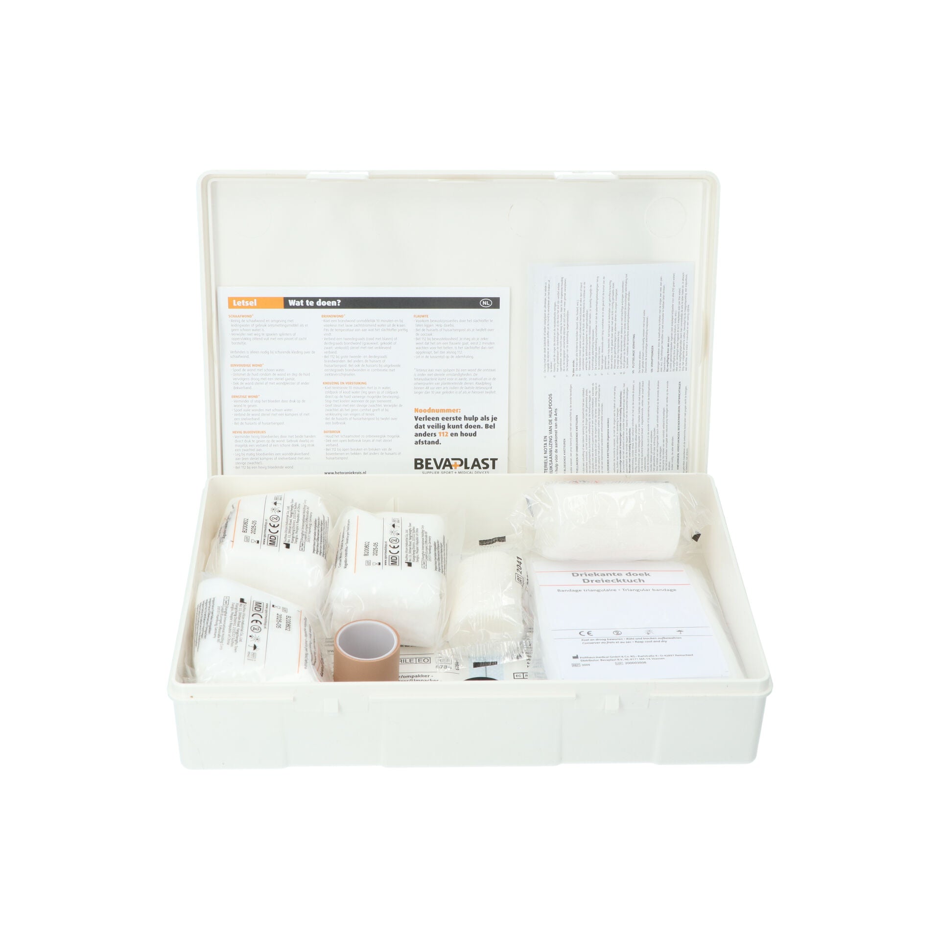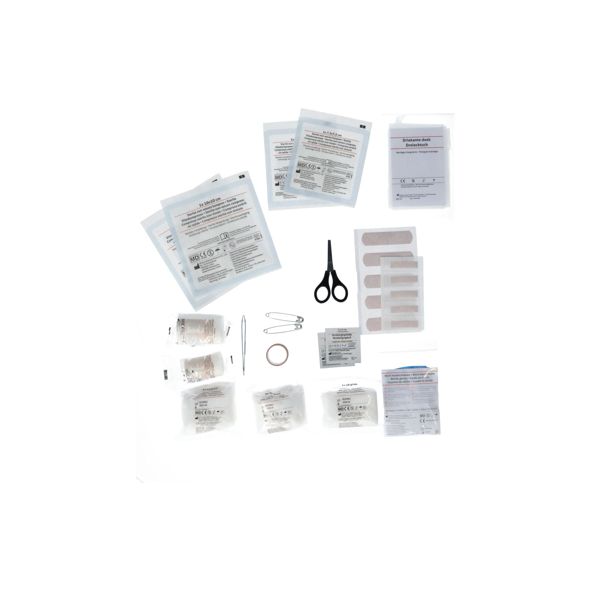 - Contenu complet : pansements adhésifs, compresses stériles, sparadrap, désinfectant, bandages élastiques, ciseaux de secours, gants jetables et fiches d’instructions.